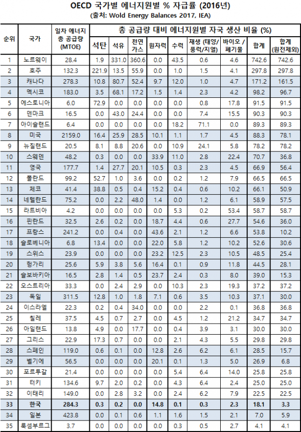 우리나라의 에너지 소비는 35개 OECD 국가중 미국, 일본, 독일 다음으로 많지만 에너지 자급률은 18.1%로 33위이다. 도시 국가인 룩셈부르그와 후쿠시마 사고이후 원전 가동율이 극히 저조한 일본만이 우리나라보다 자급율이 낮다. 올해 4월까지 우리나라의 원전 가동률이 56.6%에 불과하므로 내년에 출간될 금년도 원전자급률은 더욱 낮아질 것으로 예상된다. 원전을 제외하면 우리나라의 에너지 자급률은 3.3%로 OECD 국가 중 최하위이다. 2030년까지 일본은 원전 비중을 20~22% 수준으로 올릴 계획인 반면 우리나라는 16.6%로 낮출 계획이므로 우리나라의 에너지 자급률은 최하위 수준이 될 것으로 전망된다.